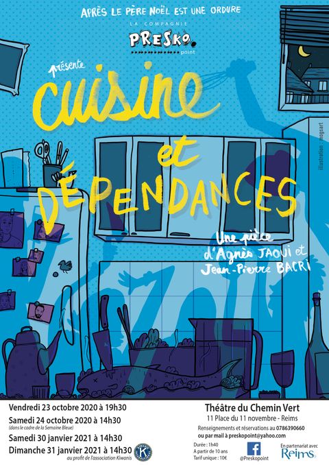 Je vous propose d''assister au spectacle : "Cuisine et dépendances" organisé par la compagnie Presko qui aura lieu au théâtre de la maison commune du Chemin Vert de 19H30 à 21H10